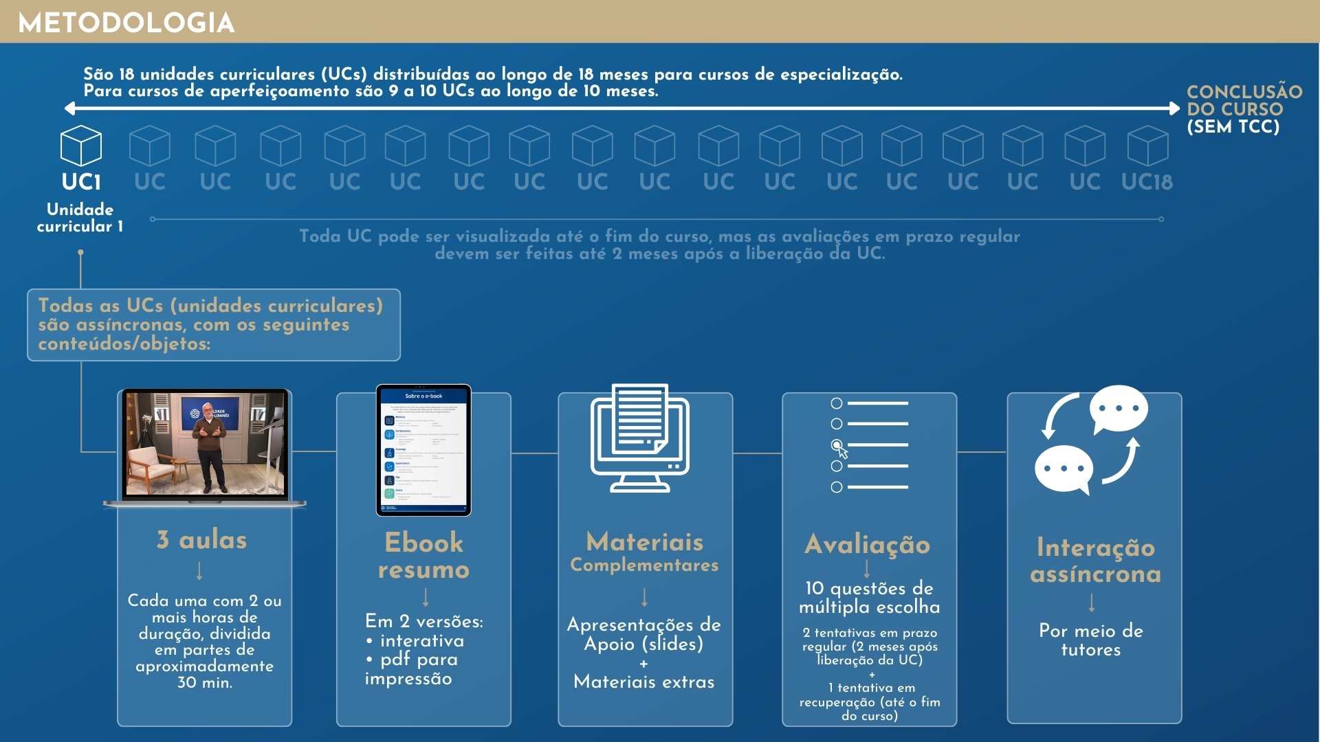 Cursos de especialização são compostos de 18 unidades curriculares (UCs) distribuídas ao longo de 18 meses, e cursos de aperfeiçoamento são compostos por 9 ou 10 UCs ao longo de 10 meses. Cada Unidade Curricular (UC) é composta de um conjunto de materiais com objetivo de uma aprendizagem ágil e ao mesmo tempo profunda, que combina teoria e prática:
