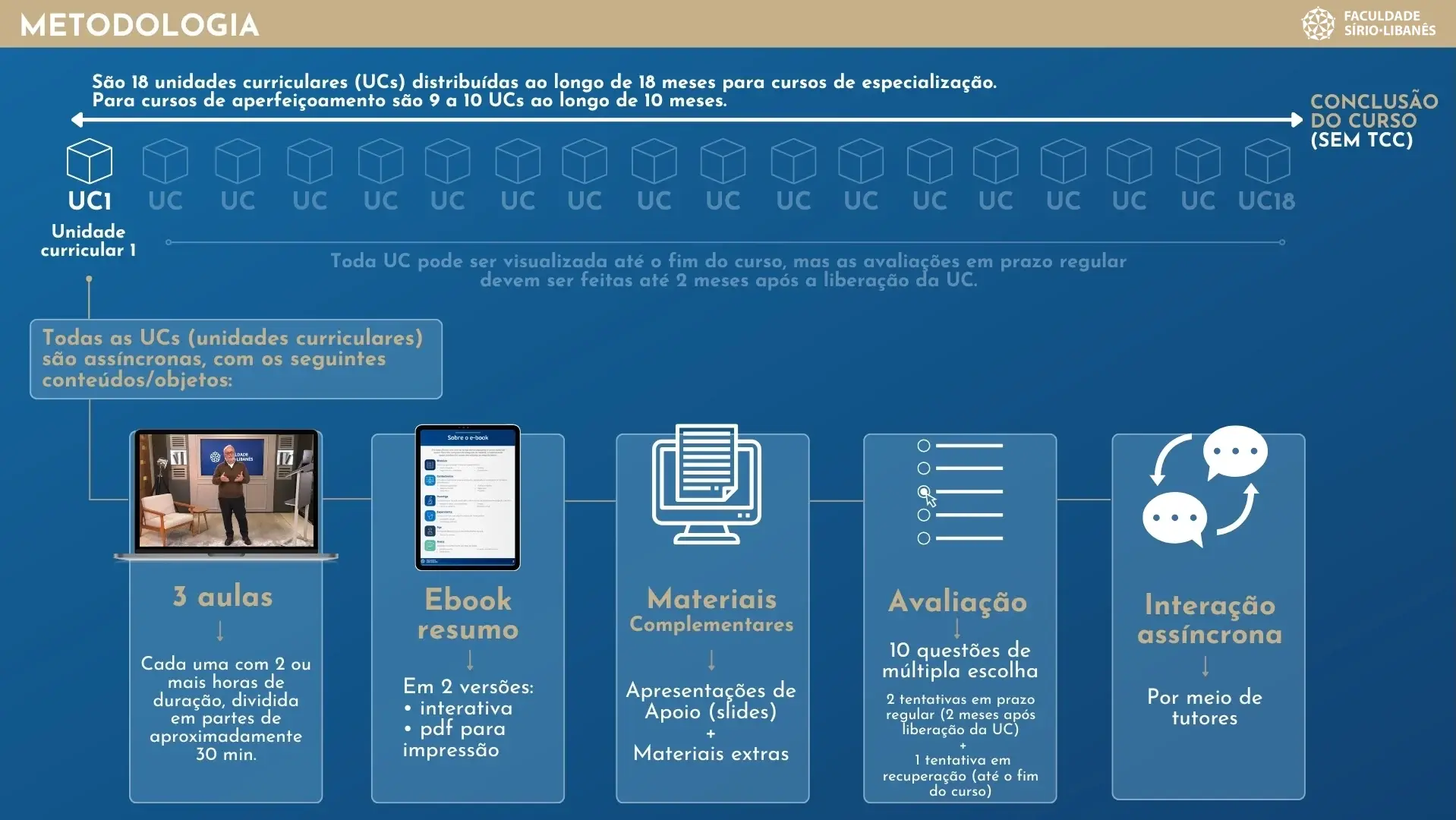 A reconhecida excelência do Hospital Sírio-Libanês na área da medicina e saúde agora também está presente no ensino digital. Com uma metodologia própria, cada curso é composto por 18 unidades curriculares que integram teoria, prática, tecnologia e a vivência de docentes e especialistas. Tudo isso em um ambiente virtual cuidadosamente planejado para proporcionar uma experiência de aprendizagem otimizada.